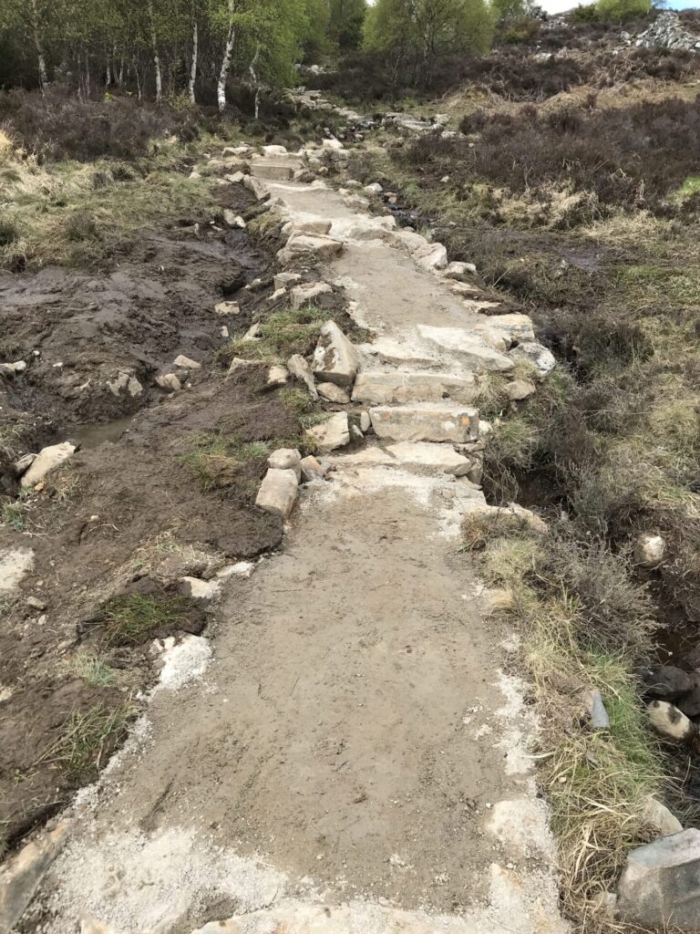 The major task was to transport surfacing material from the “drop” at Tait’s Brae up to the site – no mean feat! This meant bagging the material into sacks, loading the sacks into the power barrow, “driving” the barrow up to the top of the track and thereafter manhandling each sack up the path to where it was needed. As ever, we are grateful for the many willing volunteers and were also helped by a number of Rural Skills students from Kingussie High School.