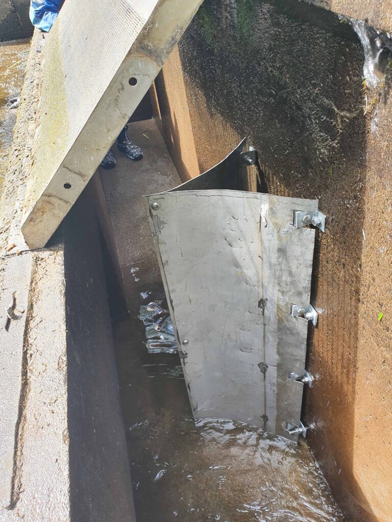 The damage to the hydro inlet screen caused by boulders has been a continuing problem since 2014. The main effect has been flattening of the curved acceleration plates which results in some of the flow missing the inlet grid. In 2021 two of the six sections of the inlet screen were replaced by new strengthened versions. This allowed the two now spare sections to be repaired and fitted with new acceleration plates. This was done by Davie Cameron the local blacksmith and they were fitted by KCDC volunteers in May this year. The effect can be seen in the two pictures below where the reduction in “spillover” from the central two sections is evident.