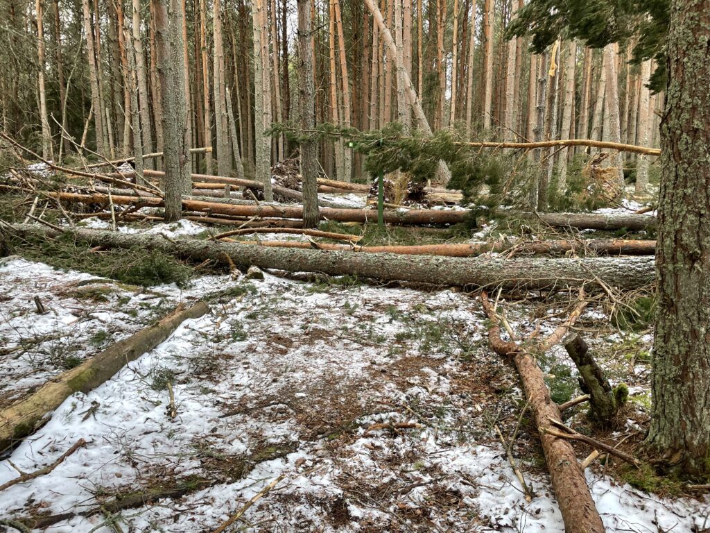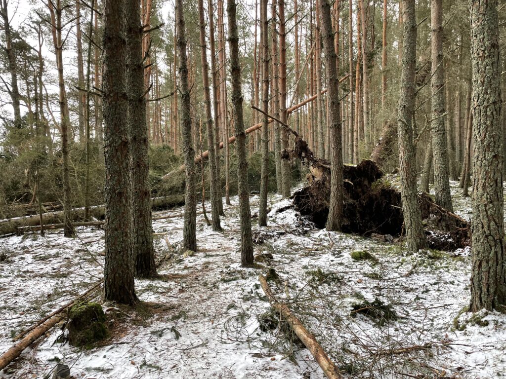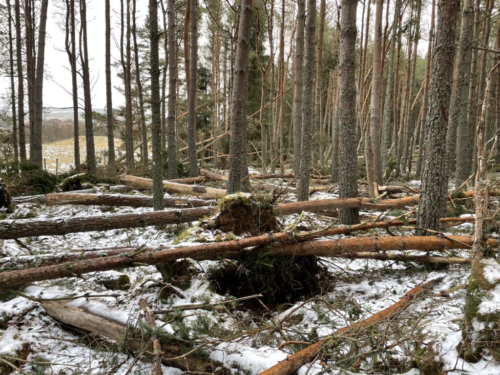 Tom Baraidh Wood has suffered significant damage to trees – particularly on the northern and eastern edges of the wood. Some of the damage can be seen in the photos below. Sadly many of the fallen trees are straddling the paths that we have been working on in recent weeks.